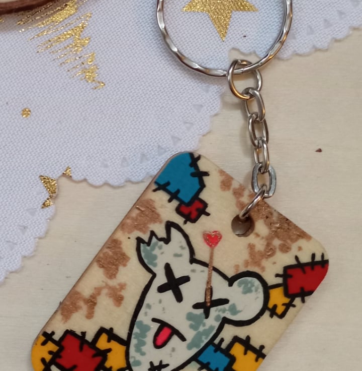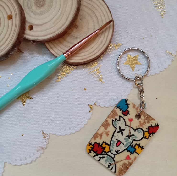 A 3cm x 4cm wooden rectangular keyring with a hand painted teddy bear in a voodoo style and a patchwork background
