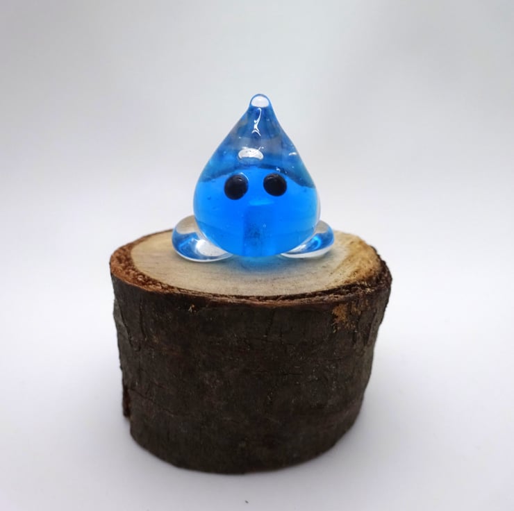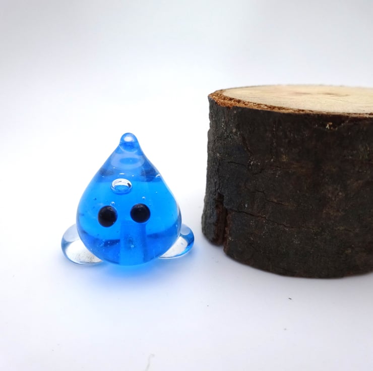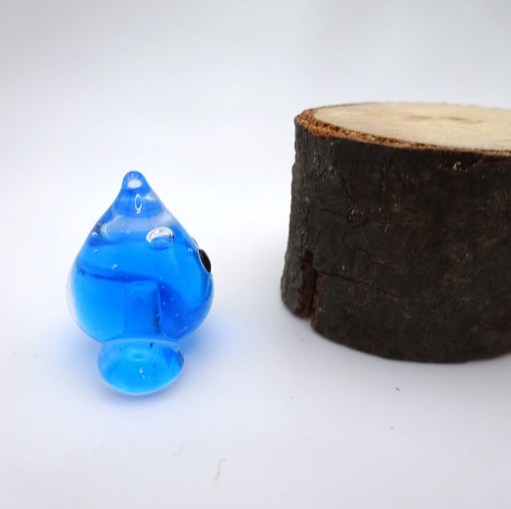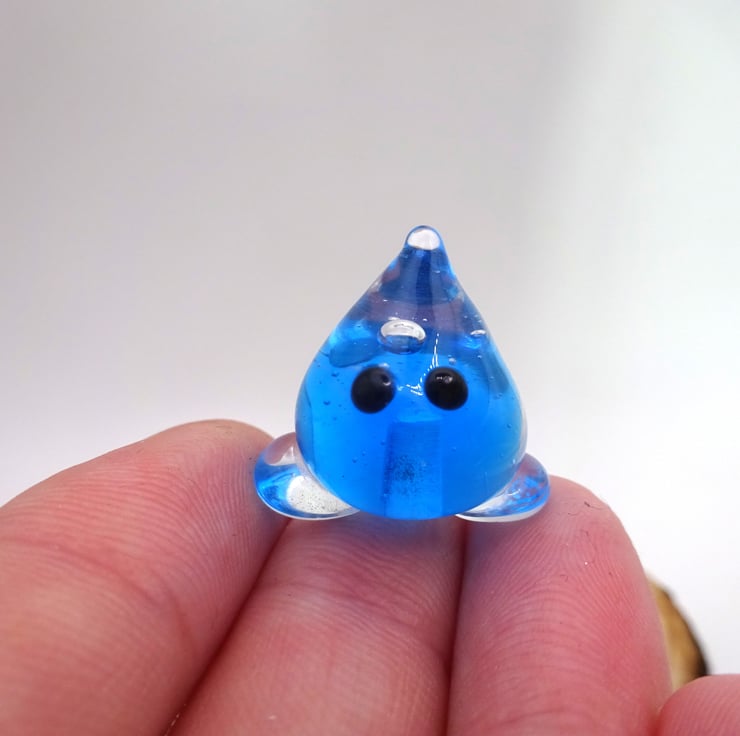 A small glass wisp figure made by hand using a technique called lampworking.