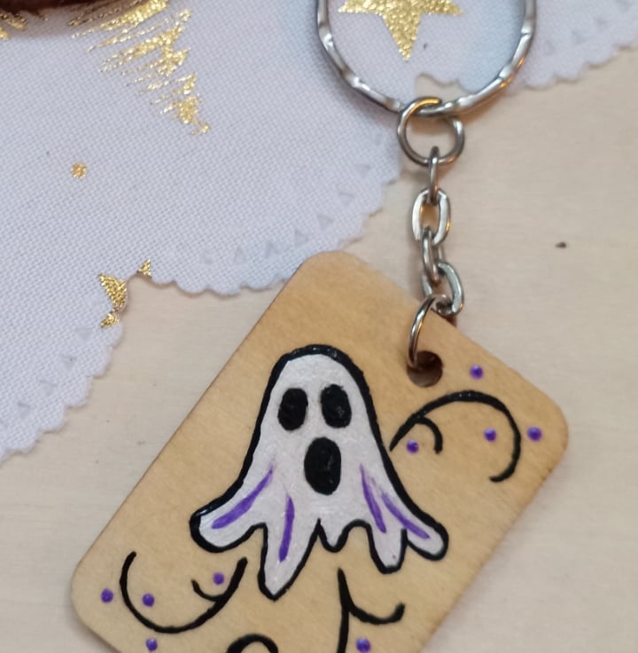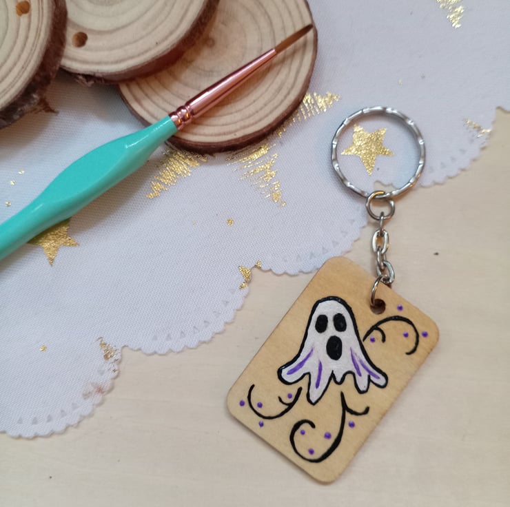 A 3cm x 4cm wooden rectangular keyring with a hand painted little ghost featuring simple swirls and purple dots