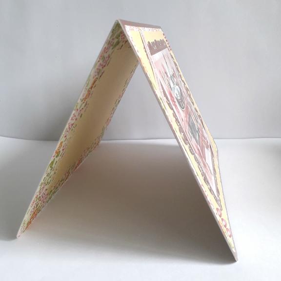 The image is in a fancy die cut frame of rose gold mirror card which is on a panel of pale lemon linen effect paper, then a flower patterned paper and more rose gold, the base card is pale lemon.