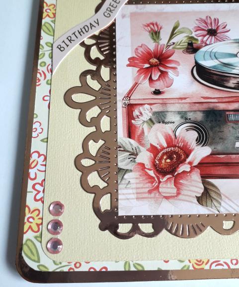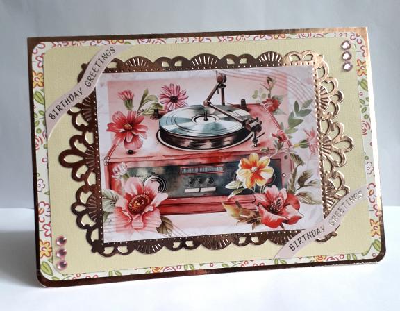 This pretty birthday card features a vintage record player adorned with flowers, in shades of pink and red and a bit of lemon.