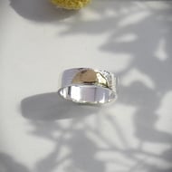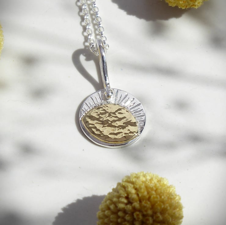 The Sol Pendant is and-forged from 925 Silver sheet and textured with a hammer to give an organic effect. I then add a layer of golden brass for the sun accent which is also textured to mimic the shimmer you see when you look towards the sun. The layered metal adds depth to this piece and the hand-engraved sun rays shimmer in the sunshine.