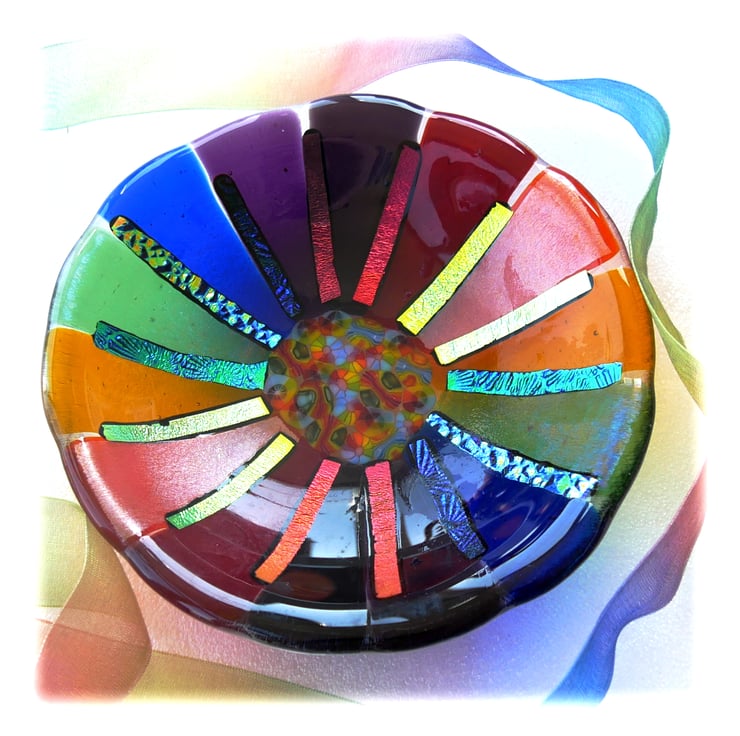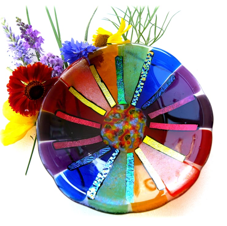 This round dish has a base of clear glass. I've then topped it with 14 segments, 2 of each colour to make up the Rainbow spectrum. Then infilled the centre with rainbow millefiori slices.