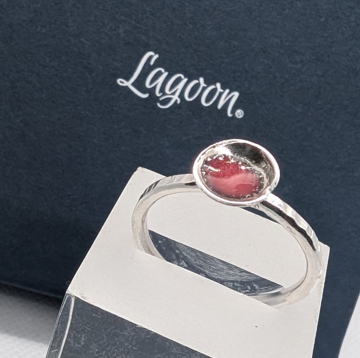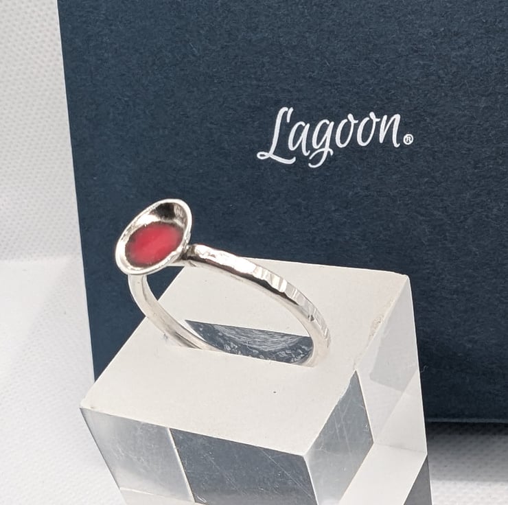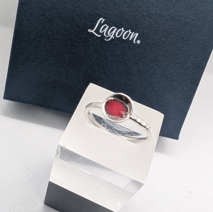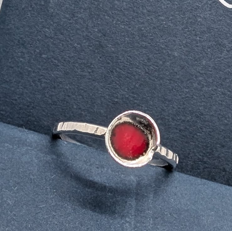 Delicate ring with domed disc with red enamel, recycled sterling silver Size S
