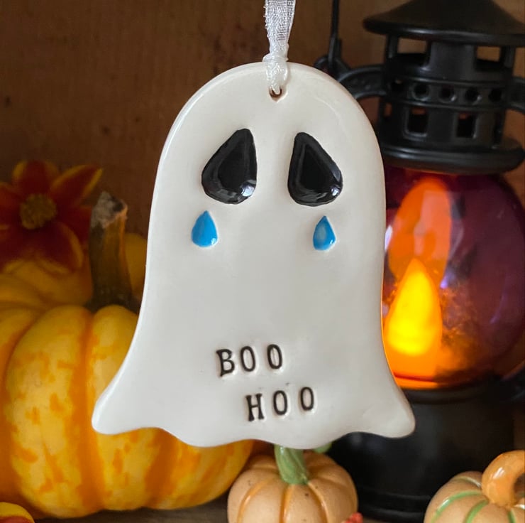 This ceramic ghost decoration has been made from white earthenware clay to my own design. Aww, he’s scared himself! It has been fired twice and finished with a clear, glossy glaze. Glazed on the front only. It measures 6cm x 5.5cm x 1cm deep and hangs from a cream organza ribbon.