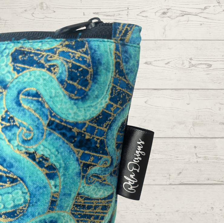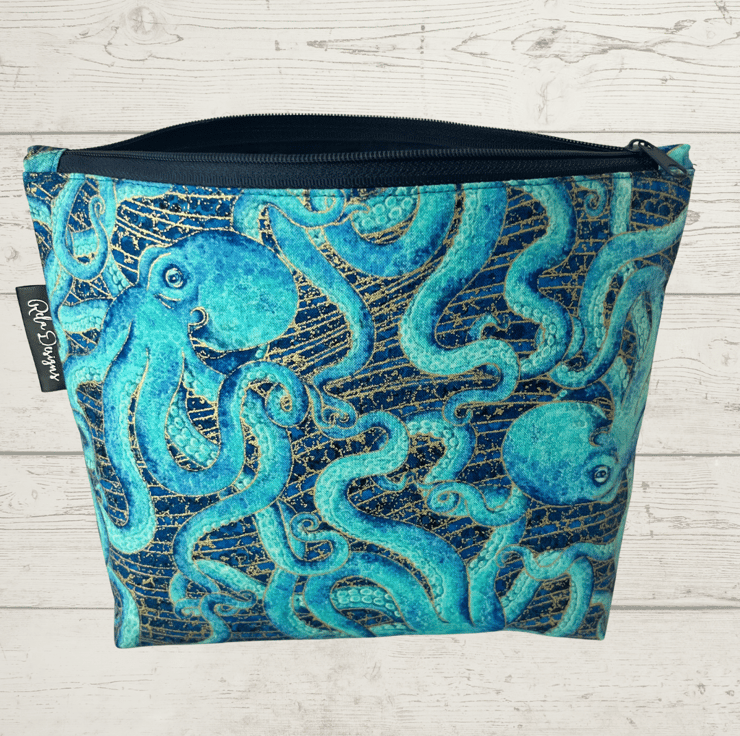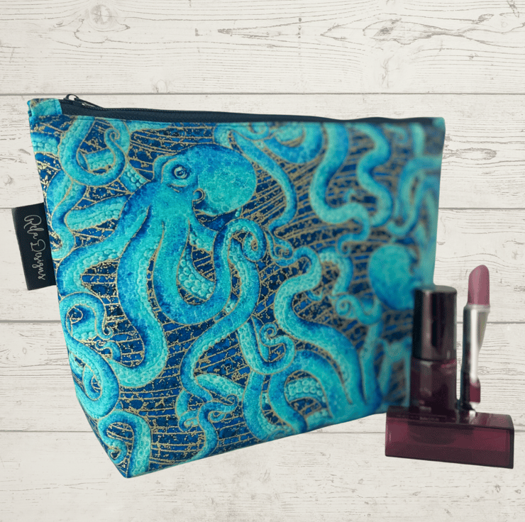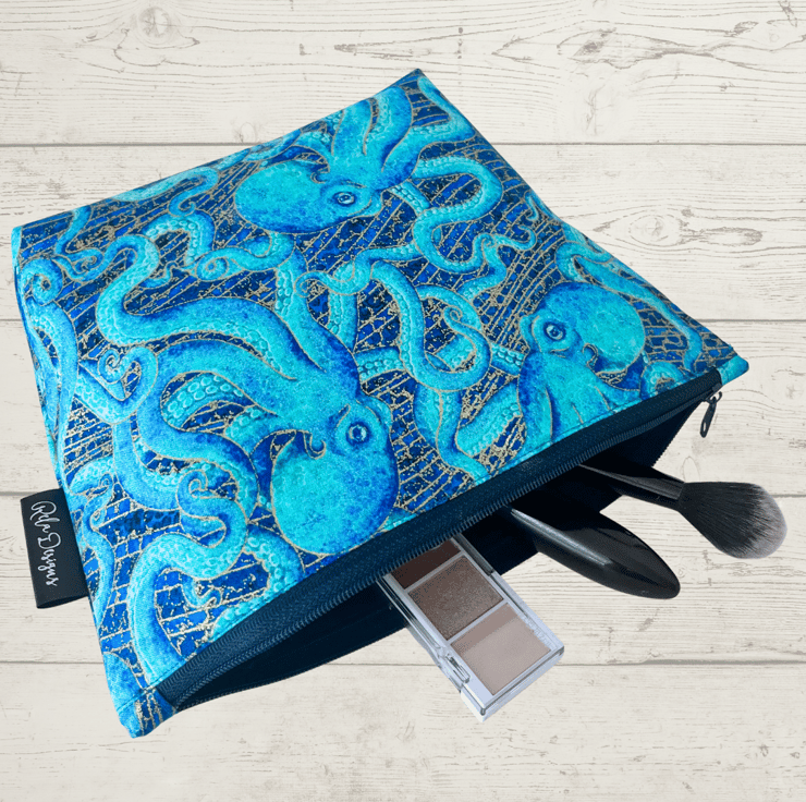 This gorgeous octopus cotton zipped pouch has a navy blue waterproof nylon lining , great for those inevitable spills.