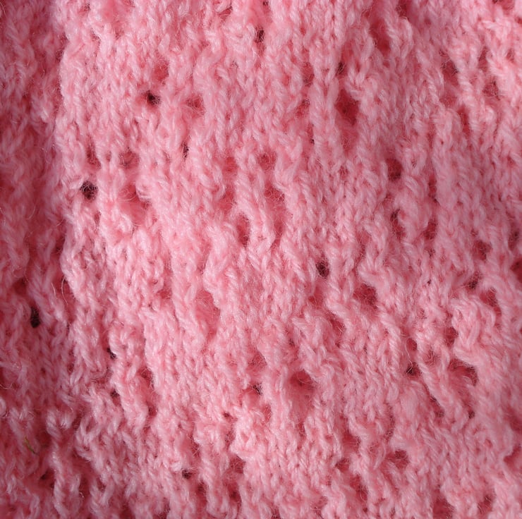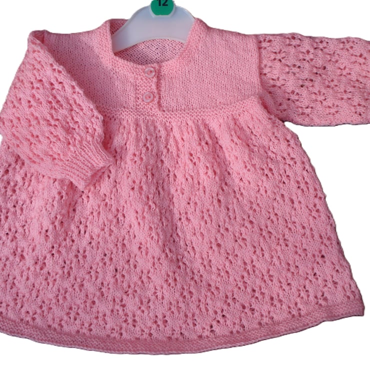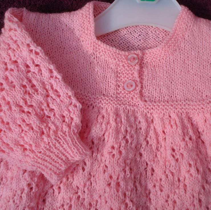 This is a hand knitted dress in a pretty peachy pink yarn. The dress has a lovely flare from the bodice which fastens with two buttons. Would make a lovely gift. Would fit 3-6 months approximately but knitting does stretch.