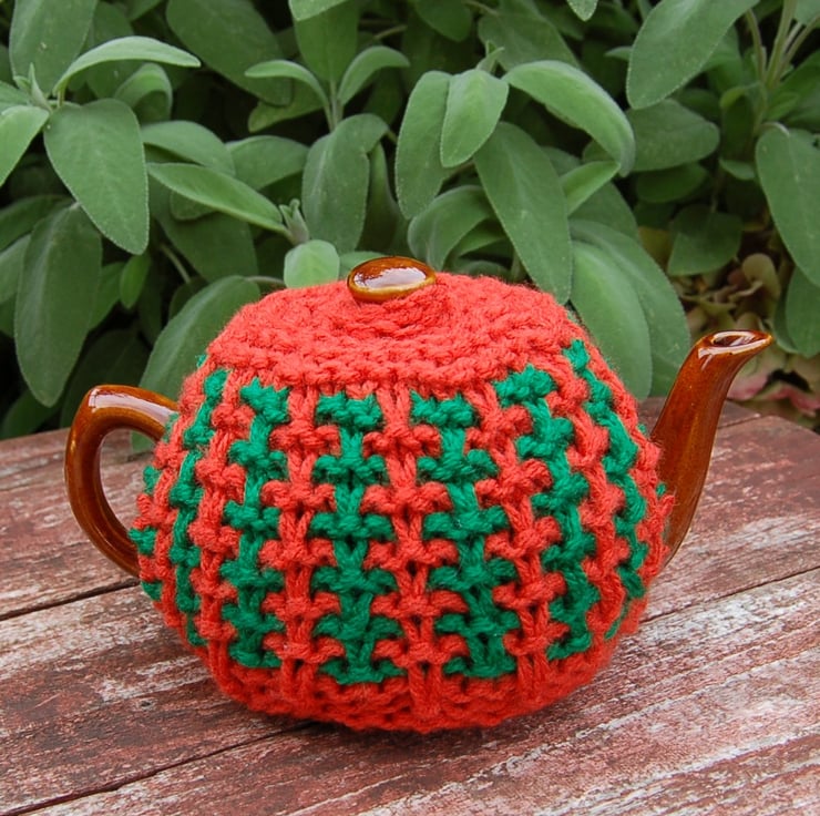 A lovely tea cosy in two tone tweed pattern.. Knitted using two strands of double knitting weight yarn in burnt orange and green. This cosy will only fit the small tea for one teapots.