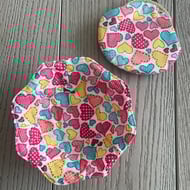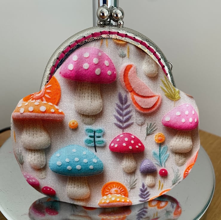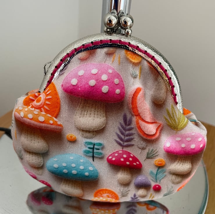 This eye popping purse is created from a cotton fabric with a fawn coloured background and 3D fungi and fauna in mainly shades of pink, blue, orange and red.
