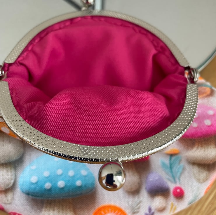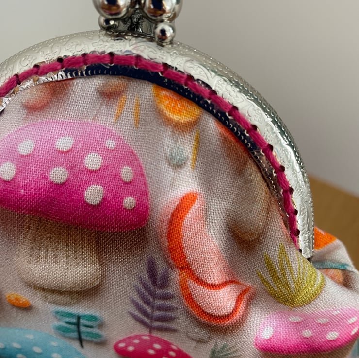 The silver coloured embossed metal clasp is sewn to the purse with a bright pink embroidery thread.