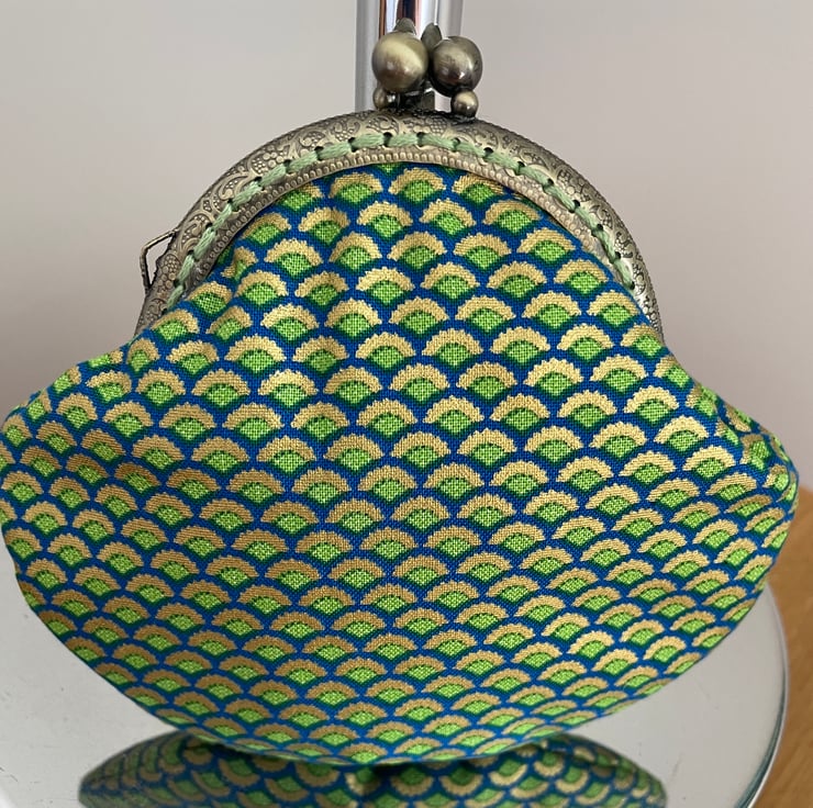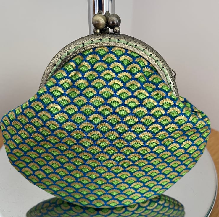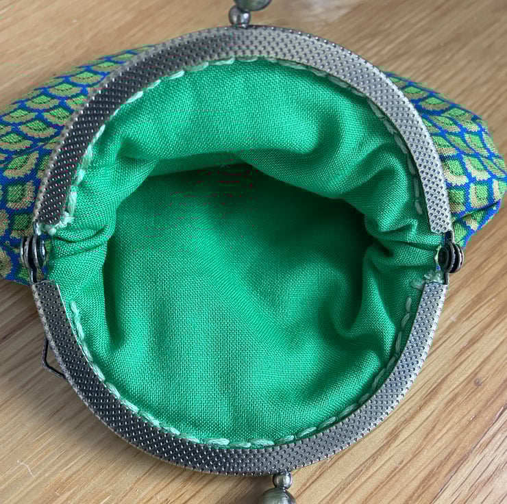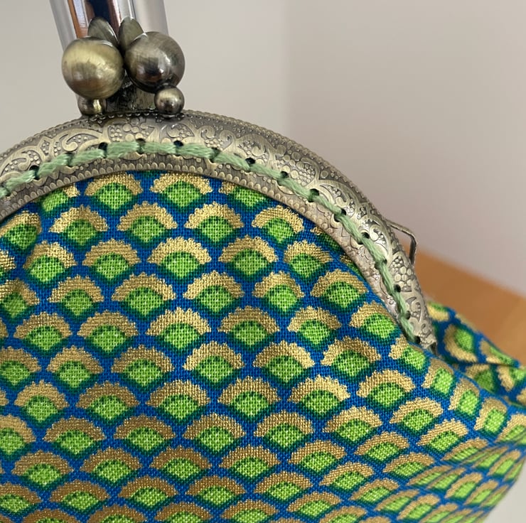 The antique gold coloured embossed metal frame is attached to the purse with a light green embroidery thread.