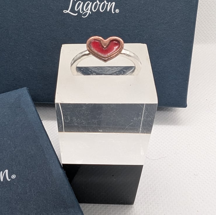 This ring has been made using my own designed heart which I have added bright red enamel within. The ring is hammered and can be stacked with other rings. The silver is from recycled silver. This ring is a Size M