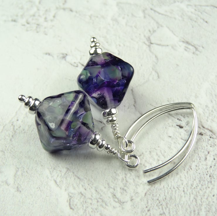 Purple & green lampwork glass drop earrings, sterling silver, handcrafted (LH4)