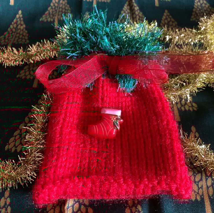 It is fun to knit these pretty Christmas gift bags. They make an interesting change from gift wrap and of course when the gift is opened you also have the bag to keep or pass on the next year to someone else with a little gift inside