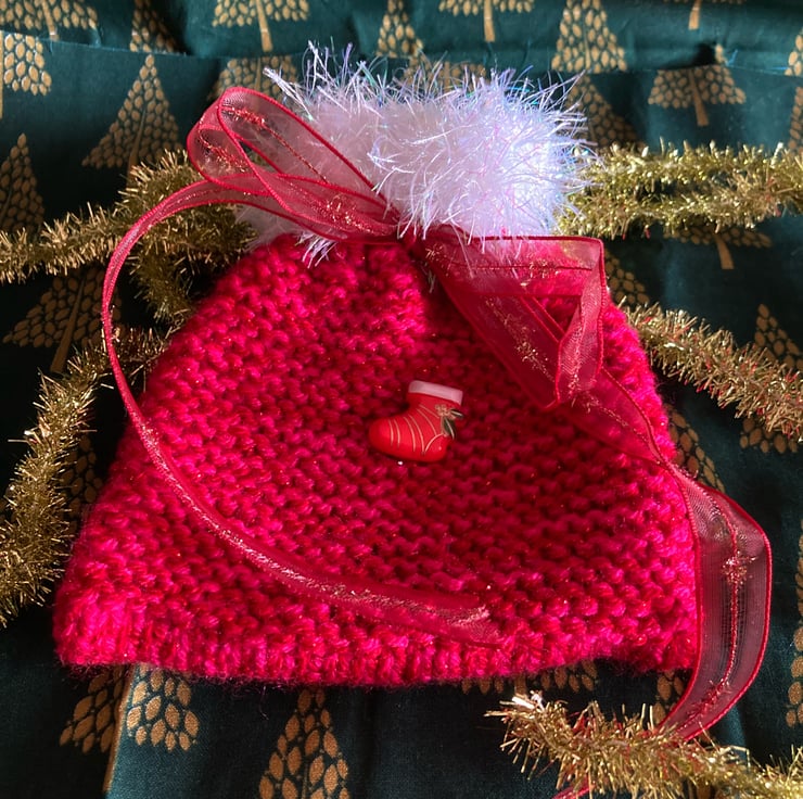 It is fun to knit these pretty Christmas gift bags. They make an interesting change from gift wrap and of course when the gift is opened you also have the bag to keep or pass on the next year to someone else with a little gift inside