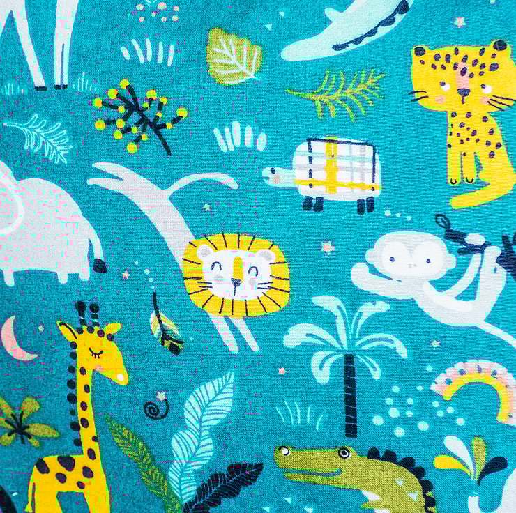 This crazy gorgeous fabric just makes me happy! A collection of fun cartoon animals mainly found on safari - elephants, giraffes, lions, crocodiles, leopards, monkeys - the lot! The lovely bright emerald/jade/teal green (hard to describe the colour) will add a touch of cheeriness to any room, but especially a child's room or nursery.