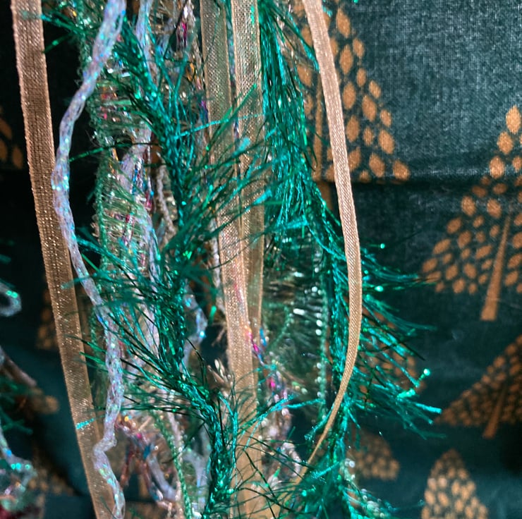 The green jellyfish has trails of gold, silver white, green and multi coloured yarn and braids.