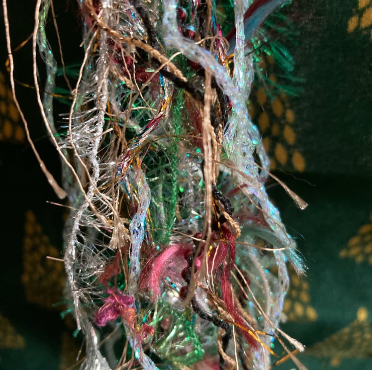The red jellyfish has trails of green, gold, silver, black, multi coloured and white braids and yarn