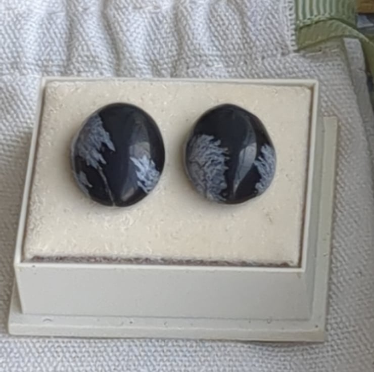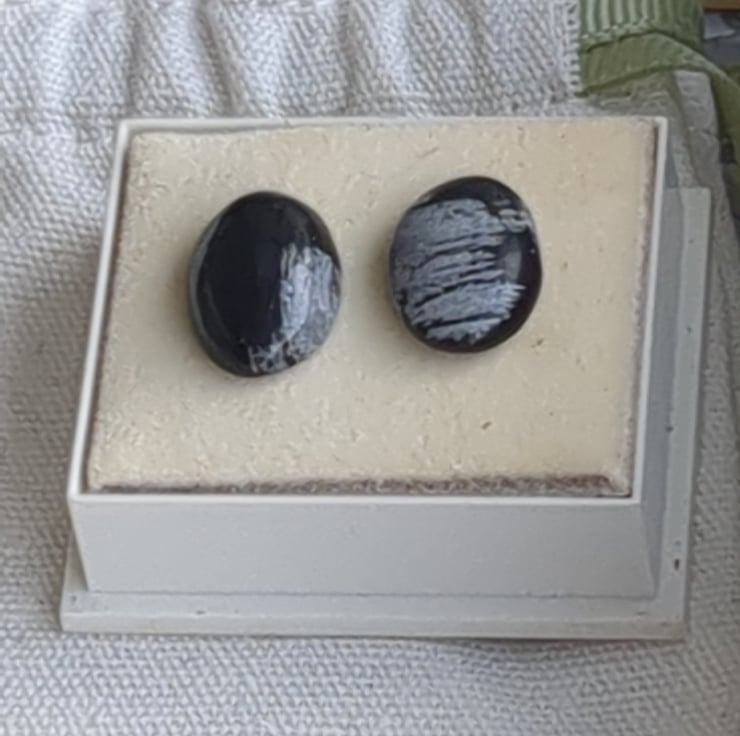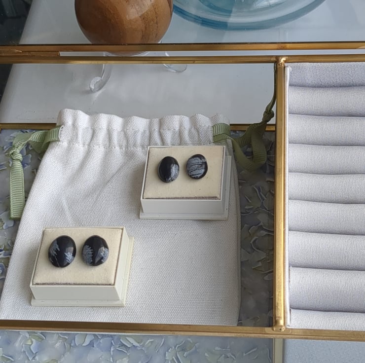 Here are some Apache tears cabochon stud earrings. Each gemstone is unique and makes a striking pair.