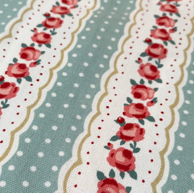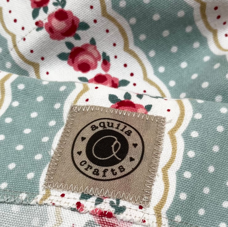 Cross back apron with square neck and wide straps in vintage style floral stripe cotton. This pretty apron has lovely deep pockets and a loose comfortable fit