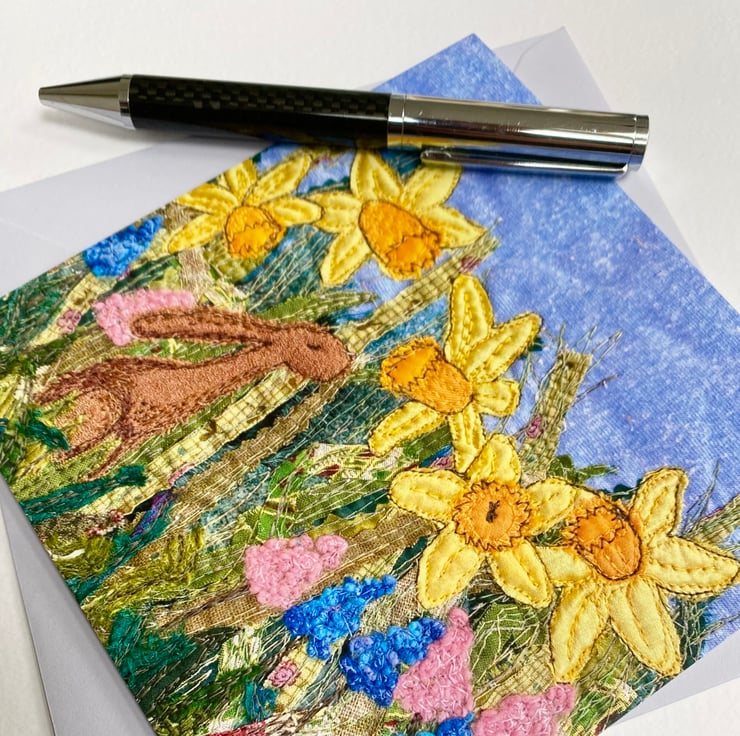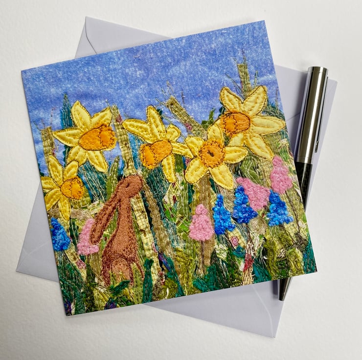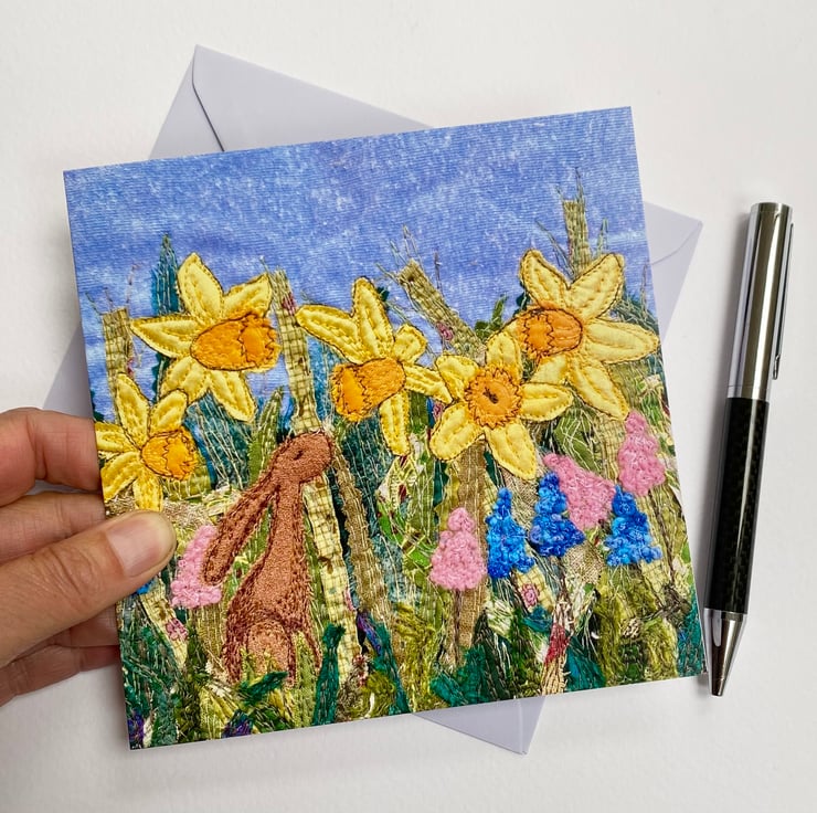 This card is a print of one of my collage pieces with free motion embroidery. This one shows a gorgeous sweet little hare smelling daffodil and muscari flowers. It’s ideal for any occasion. The card measures 14.5 square and it comes with a matching envelop in a plastic cover for protection.