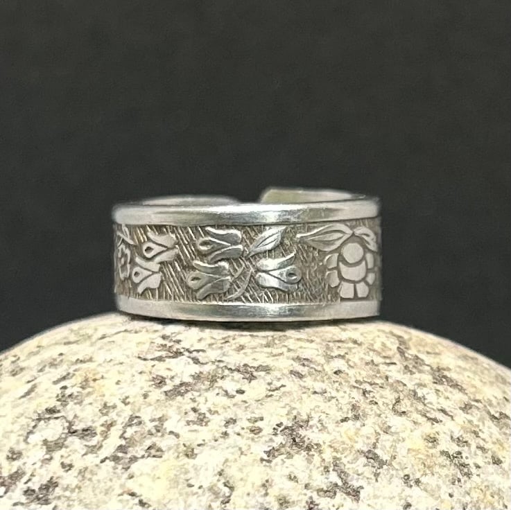The ring features a floral and leaf pattern, delicately engraved around the band, giving it a touch of vintage charm with a modern twist. Its both stylish and practical.