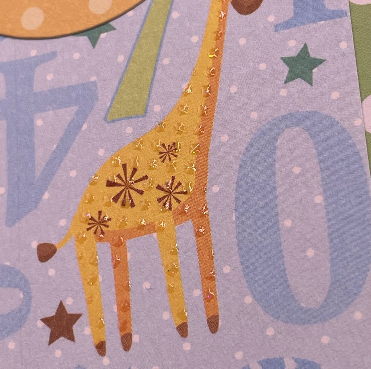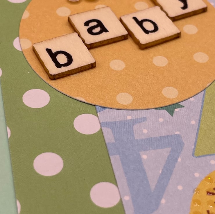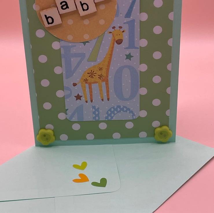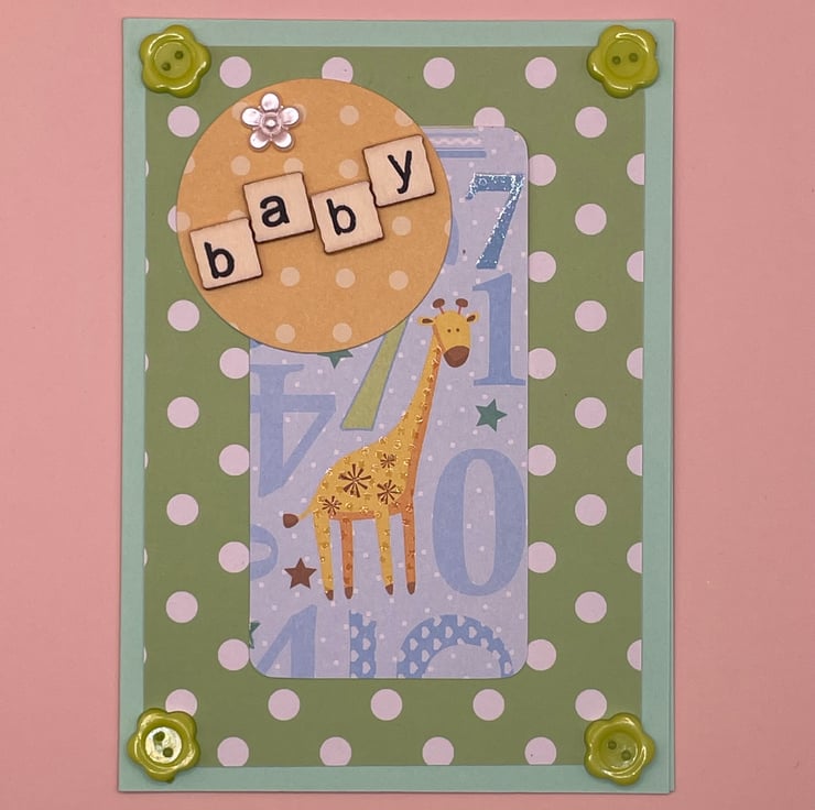 This glittery cute giraffe brings a smile and baby wishes to new parents. The words "baby" are on wooden tiles mounted on polka dot card to match the cute polka dot theme. Lime green floral buttons in the corners compliment this unique design that will be treasured as keepsake. The main card is pale green with matching envelope and measures 11.5cm by 16cm. Inside is blank.