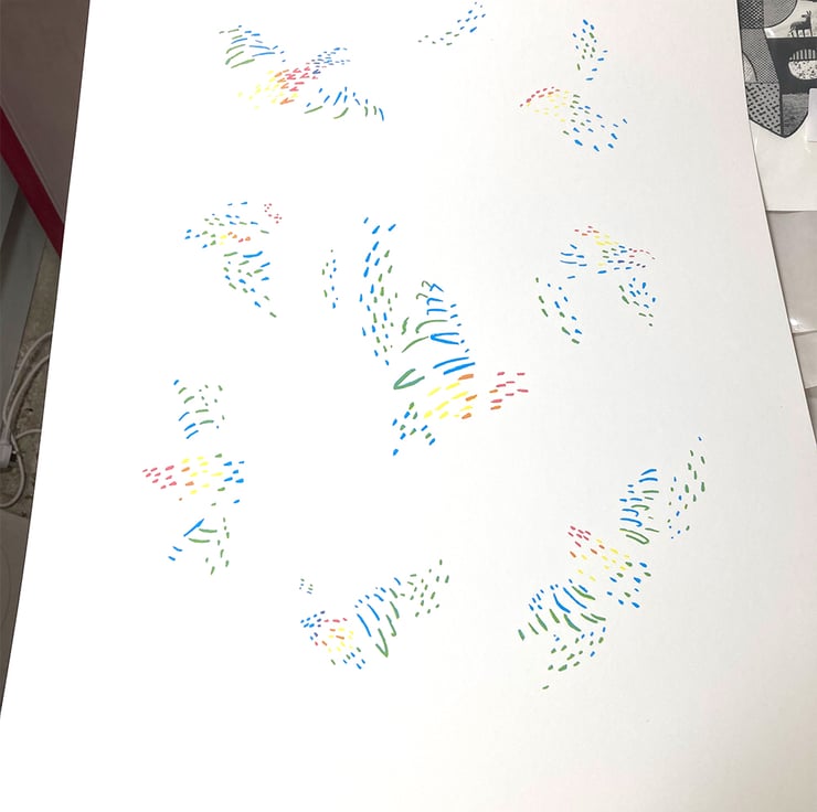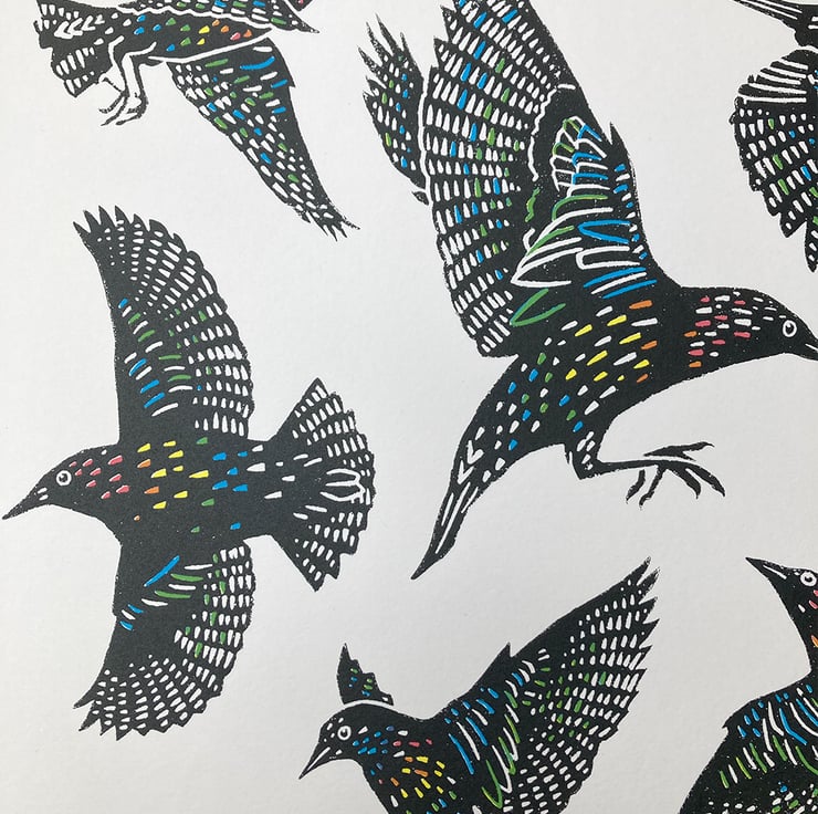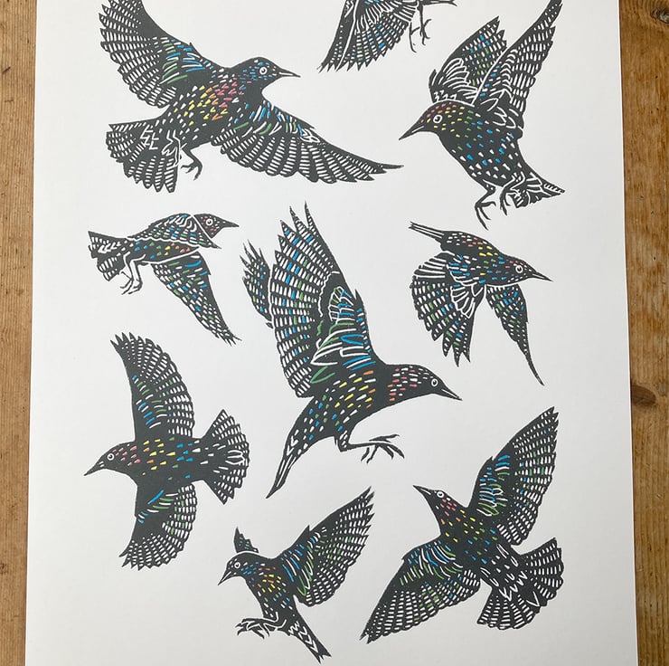 One of the first prints I created was a one-colour print of a starling. Since then, I have always wanted to try and create a print of a group of them in flight, showing off their magical patterns and colours. I guess it is a mini-murmuration!