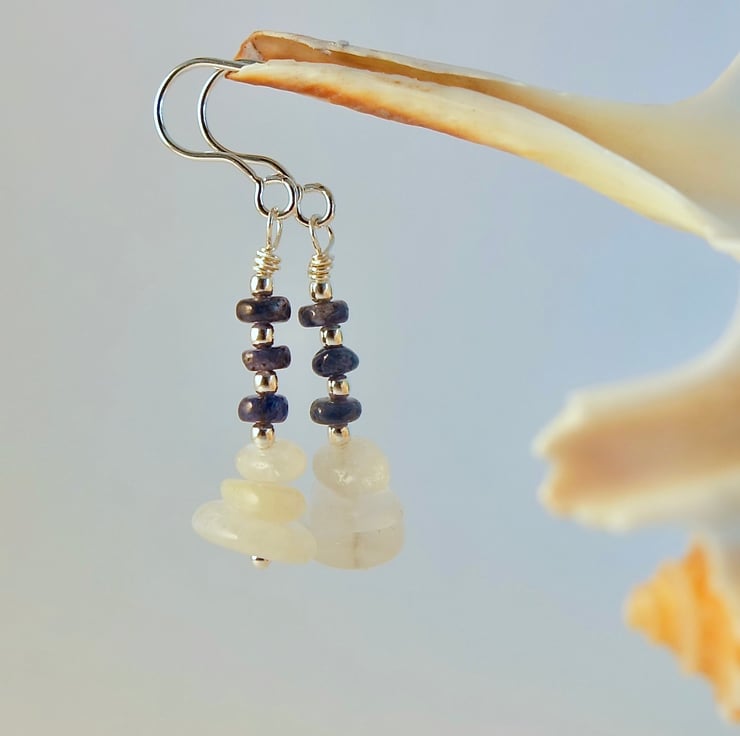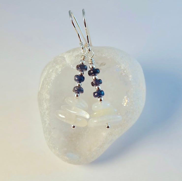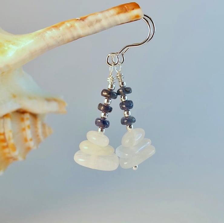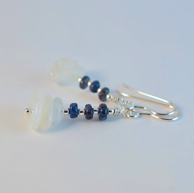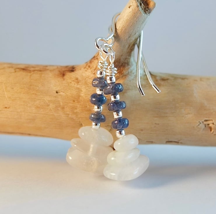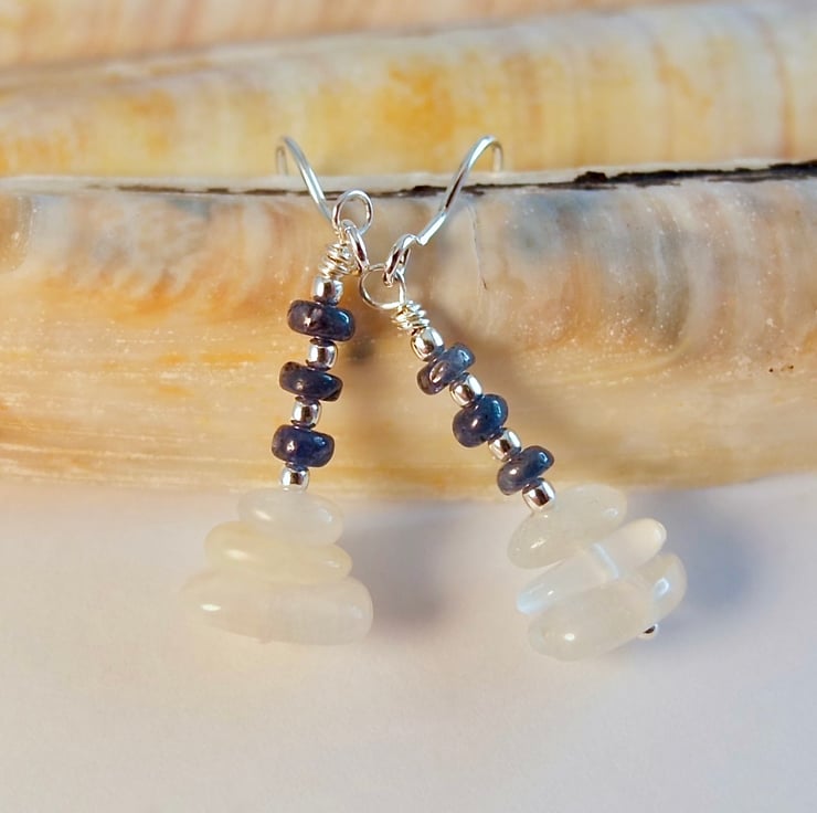 Each dainty gemstone earring features a trio of white Moonstone nuggets topped with a trio of genuine Sapphire rondelles, separated by 1.8m sterling silver spacers.