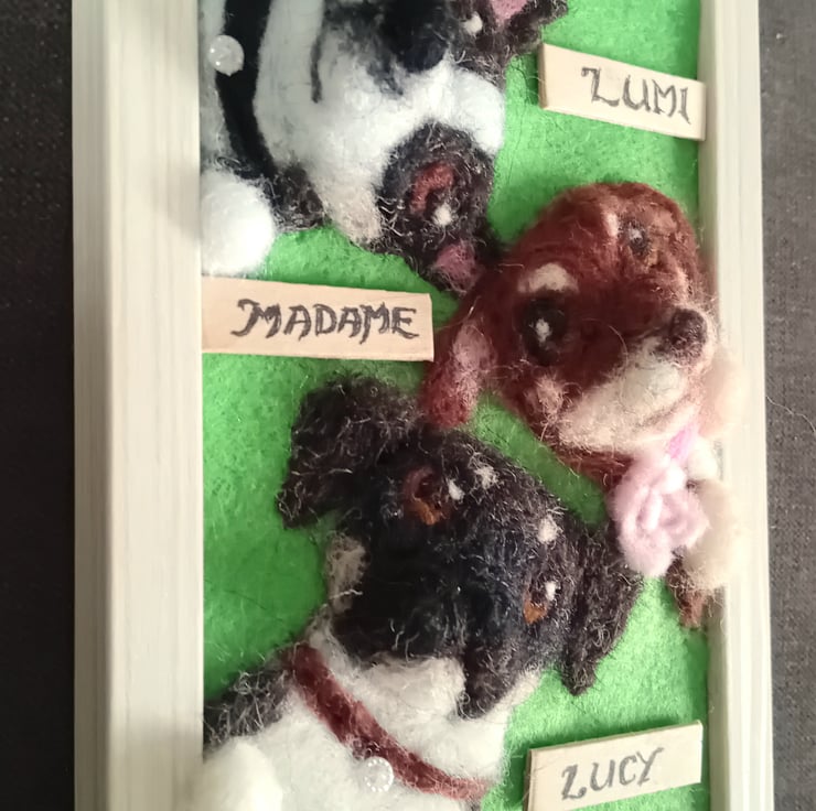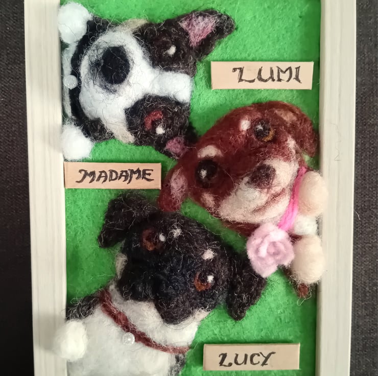 Customisable needlefelt pet portrait of up to 4 pets. Faces and paws, collars if needed and name tags.