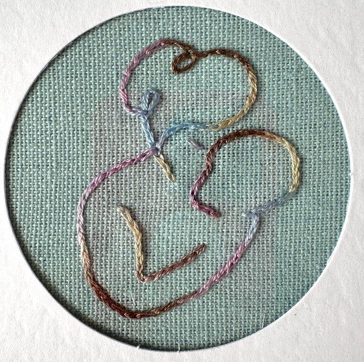 Delicately embroidered onto a pastel blue, raw linen fabric with a beautifully contrasting DCM thread that goes through several subtle colour changes.