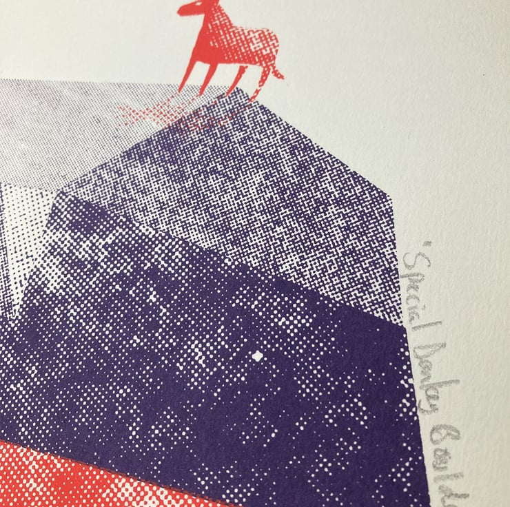 This is a two-colour screen print entitled 'Special Donkey Boulder' printed in bright red and deep purple.