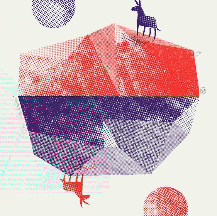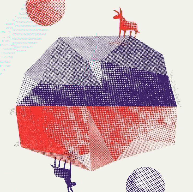 In this print two donkeys experience a magical boulder in donkey-world, which appears to defy gravity. This print is somewhat unique as can be displayed either way up, with either the red or the purple donkey at the top!