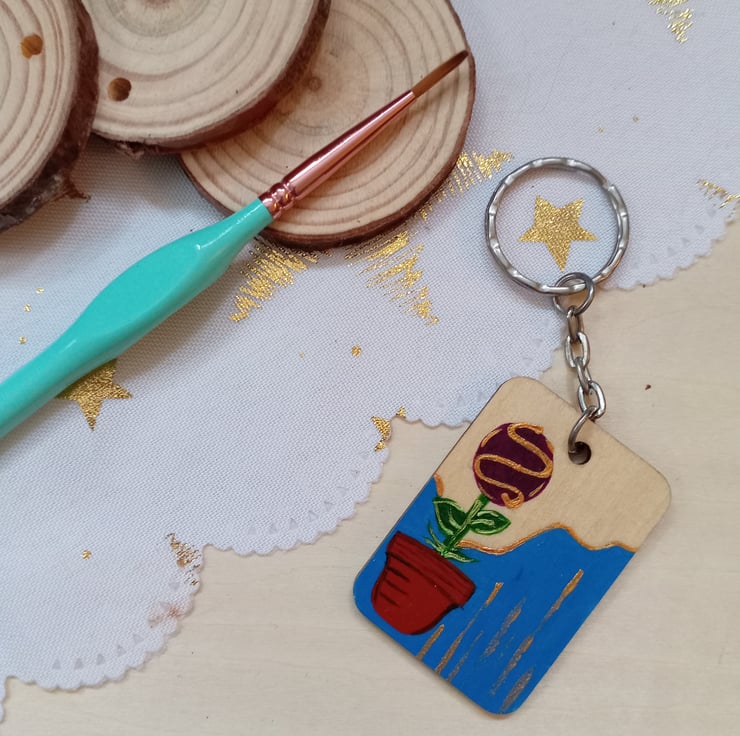A 3cm x 4cm wooden rectangular keyring with a hand painted purple potted flower design in a unique style features a blue and gold background pattern