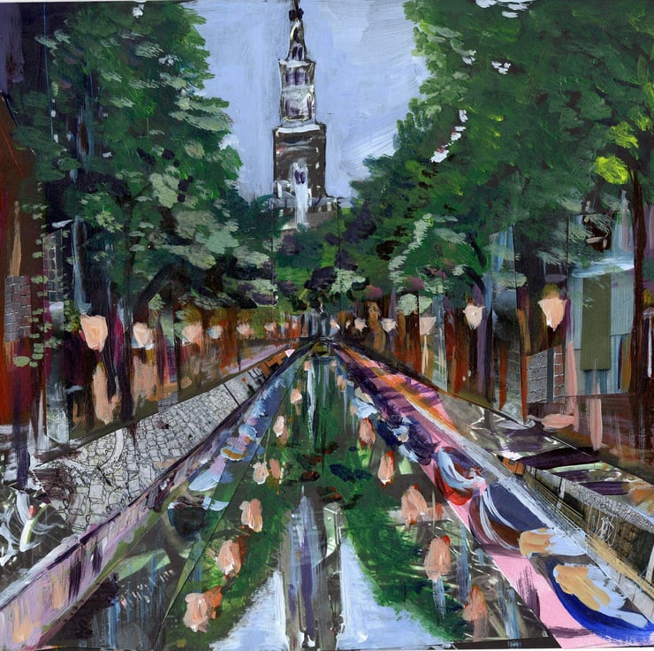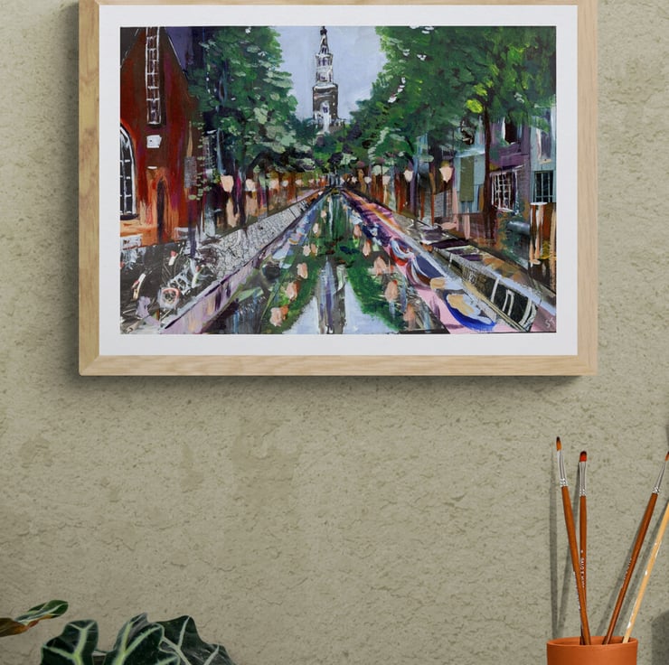 During Lockdown in New Zealand I was thinking about the joy of travel happening again one day so I created a mix media city scape of Amsterdam . This is an A4 print of the original art I made.
