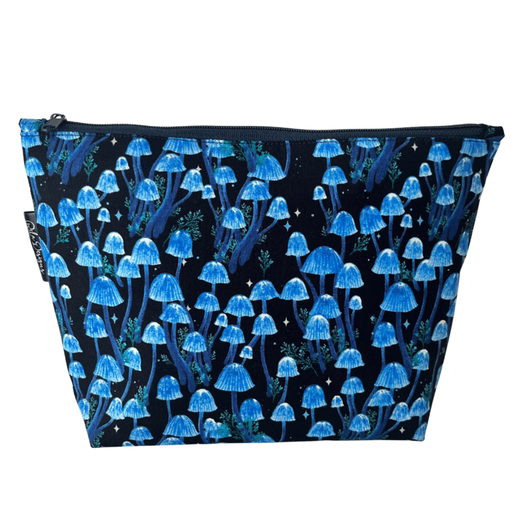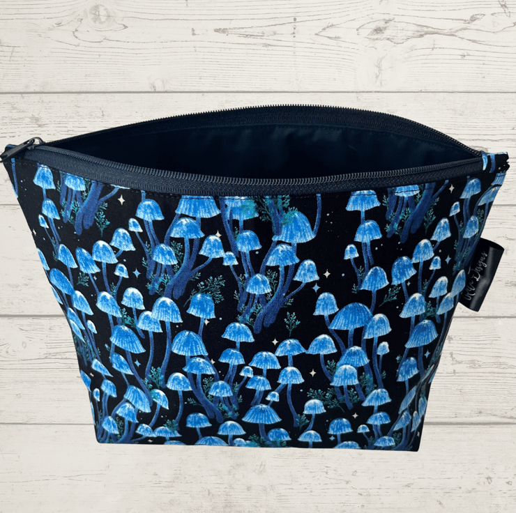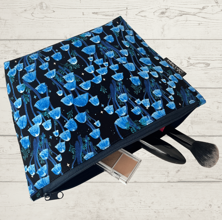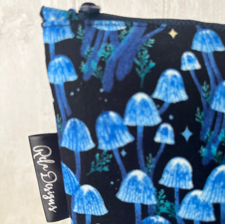This gorgeous mushroom cotton zipped pouch has a navy blue waterproof nylon lining , great for those inevitable spills.