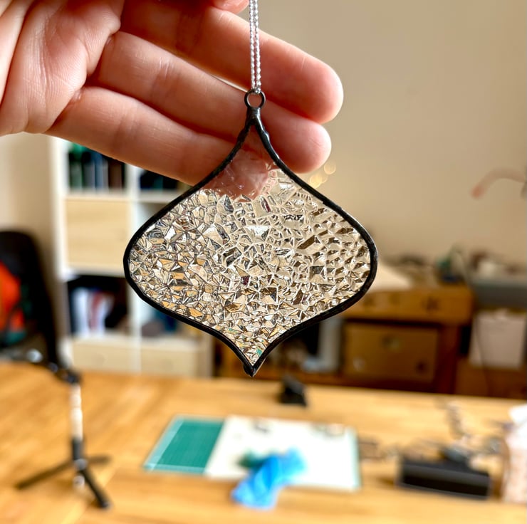 This stained glass Christmas bauble has been made from gorgeous textured stained glass that brings me back to festive winter mornings with icicles hanging of the roof of my house in Poland where I’m from.