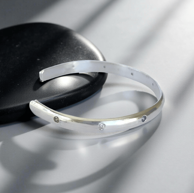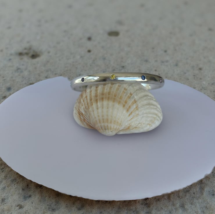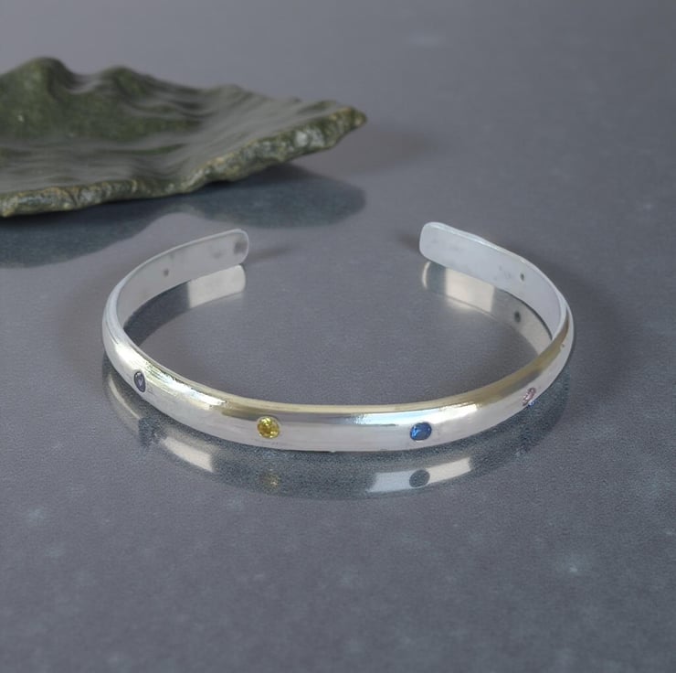 A stunning recycled sterling silver cuff, 6mm wide and 2mm thick, crafted from solid 925 sterling silver. This artisan design features seven sparkling multi coloured 2mm cubic zirconia stones in a traditional gypsy setting. you can customise with your own favourite zirconia colours, making it a truly personal piece. Handmade with care in Woolacombe, North Devon by SilverLines Jewellery.