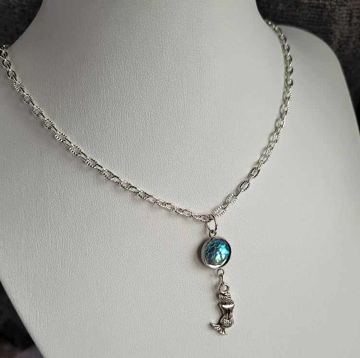 Beautiful minimalist pendant necklace featuring an adorable tiny mermaid charm, attached to a pretty iridescent mermaid scale cabochon, which really catches the light and displays a rainbow of different colours and sparkles as it moves.