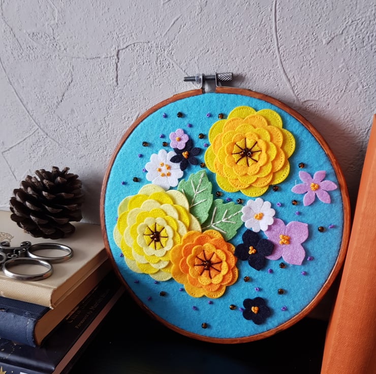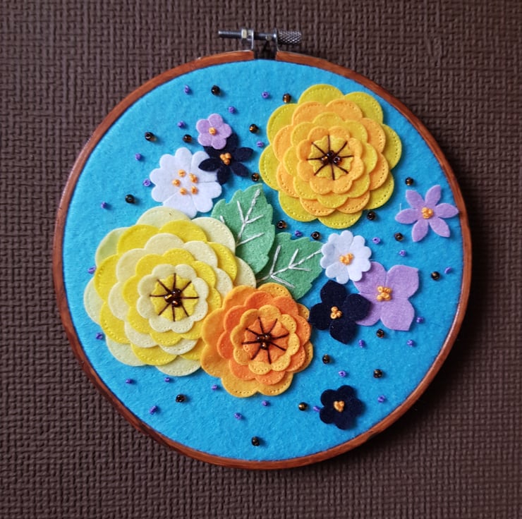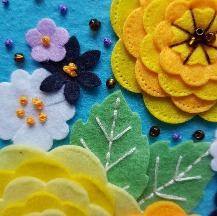 Colourful Layered Felt Garden Flowers - with hand embroidery wall decoration