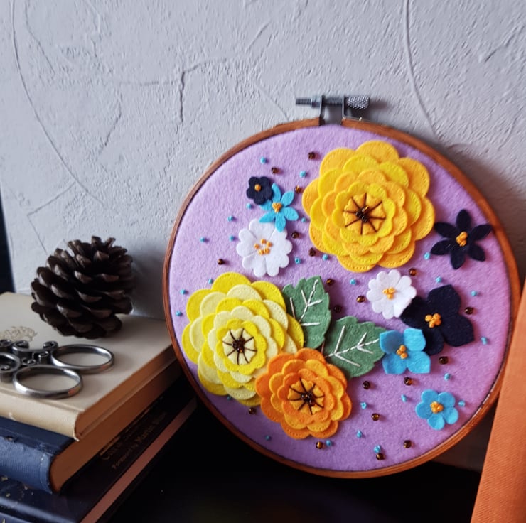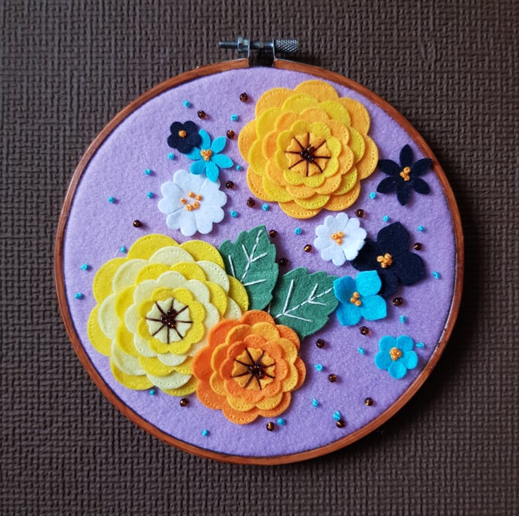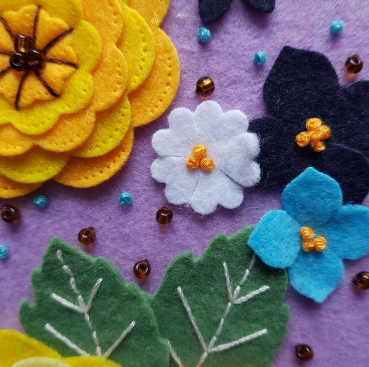 Colourful, Layered Felt Garden flowers with hand embroidery - wall decoration