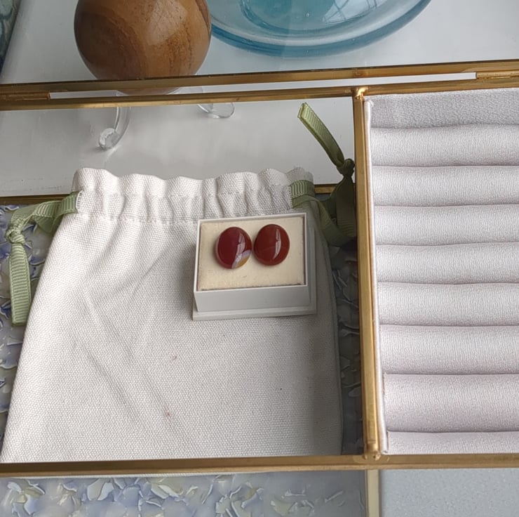 Here are a pair of carnelian cabochon stud earrings. The natural variations in the gemstones makes each one unique.