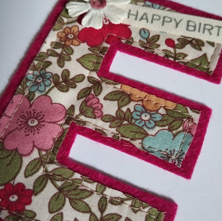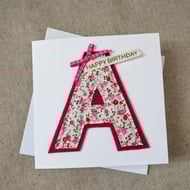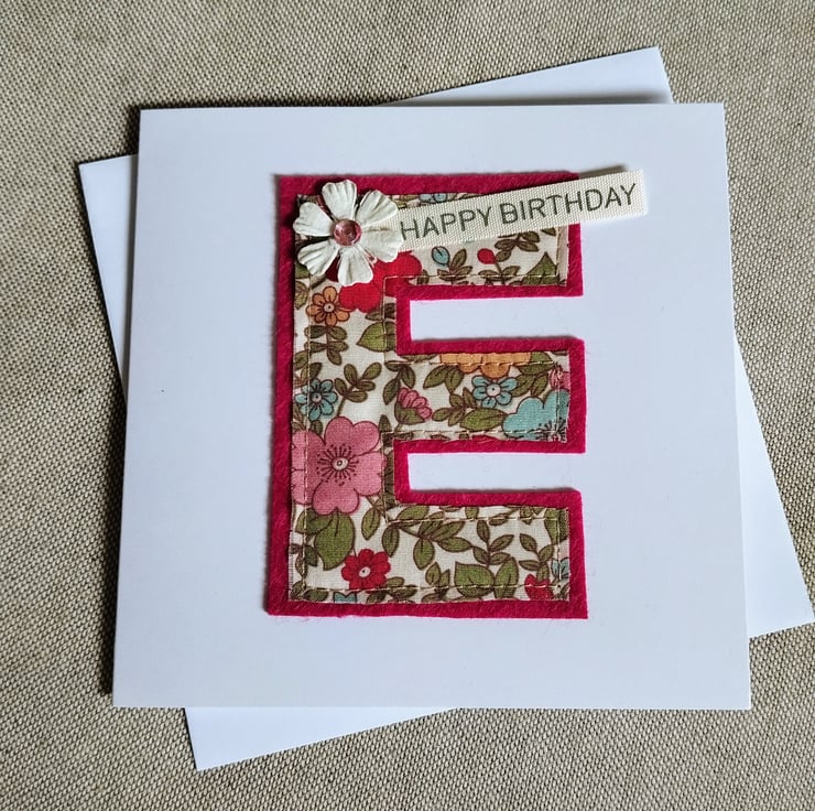 I have used pretty floral fabric for the letter, and sewn it onto coordinating coloured felt to make it stand out more. The card measures approx 12.5x12.5cm and is blank inside.
