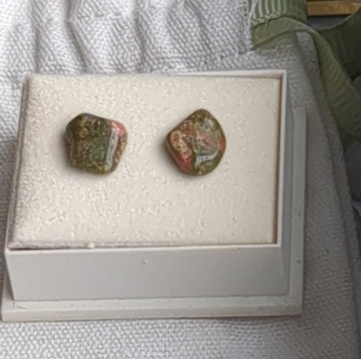 Here are a pair of unakite stud earrings. These beautiful gemstones show the unique variations of the natural gemstone.