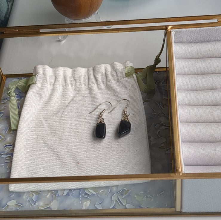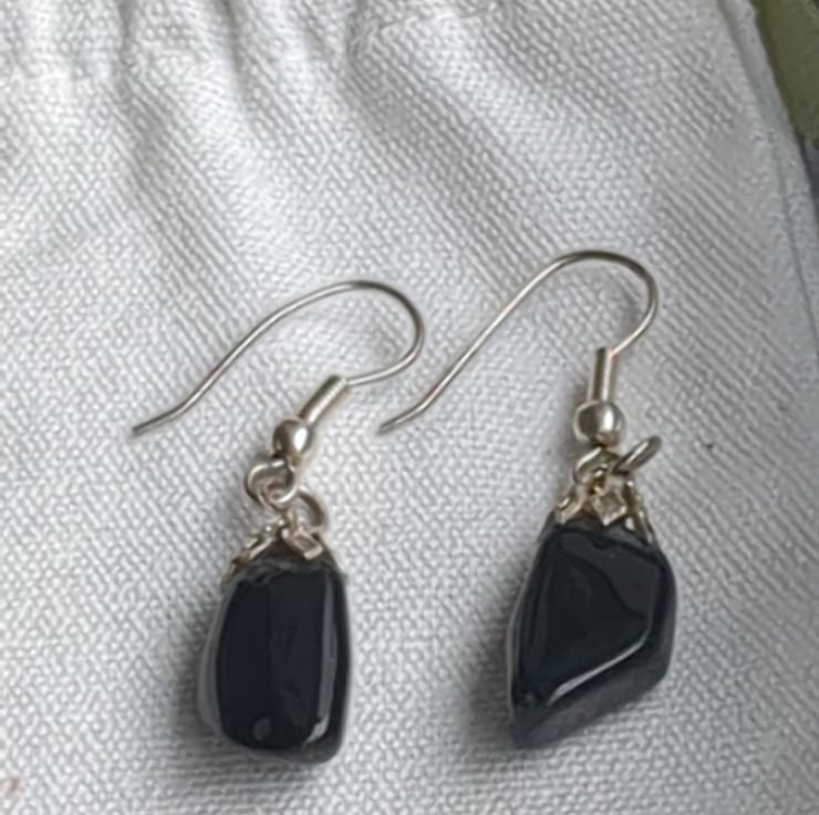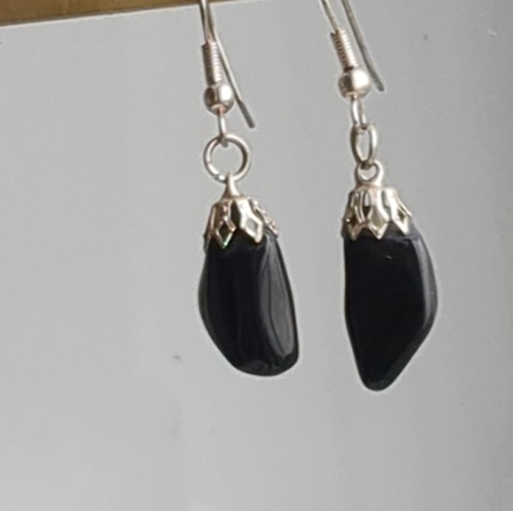 These black agate gemstones are simply presented in silver clasps to create these dangle earrings.