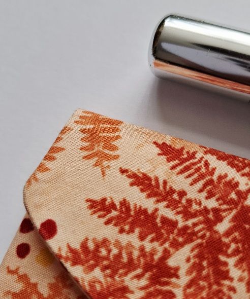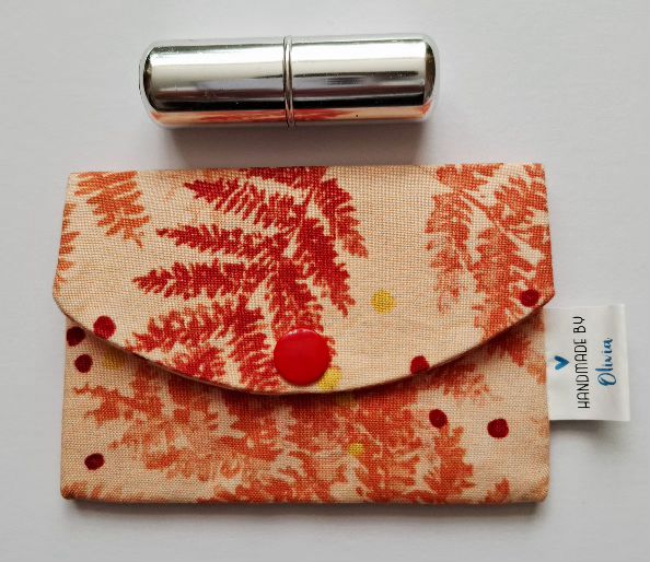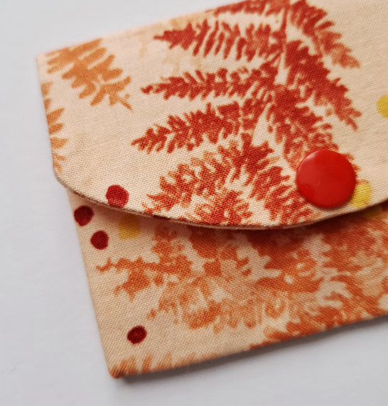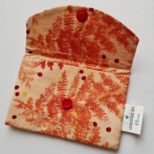 Handmade orange patterned card holder sewn together with cotton fabric and self-lined. This card holder features a light orange background with dark and light coloured florals and dots and an orange-red snap fastener to help keep your items secure. There are so many uses for these card holders. They are ideal to hold any bank cards, lipstick, lipbalm, folded banknotes, couple of plasters, hair ties, holiday let keys and the list goes on.