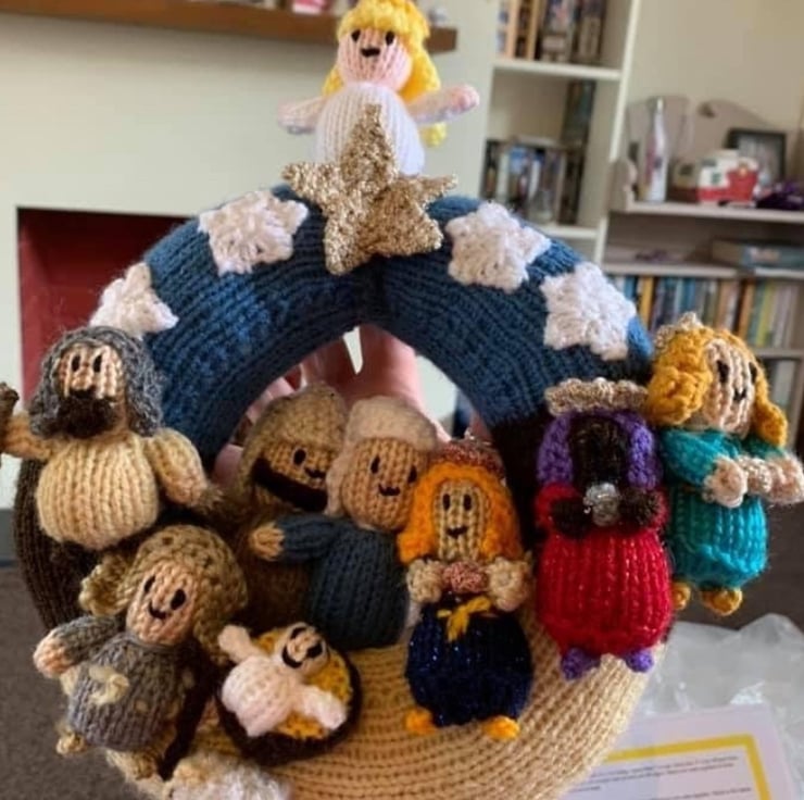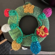 The knitted wreath is wrapped around a polystyrene ring and then the individual
