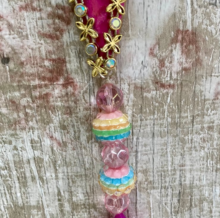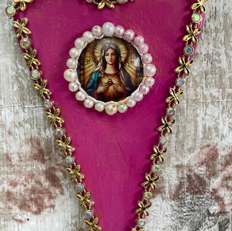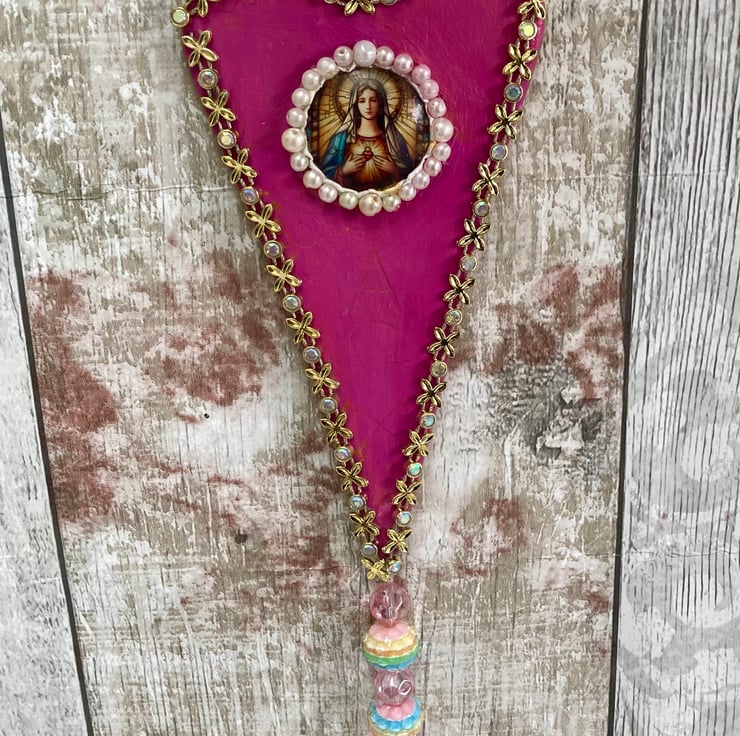 This heart is individually hand-formed from natural clay, lovingly detailed with glass cabouchon of an image of the Sacred Heart of Mary. Jewelled trim and handmade beaded tassel in pearly colours and pinks