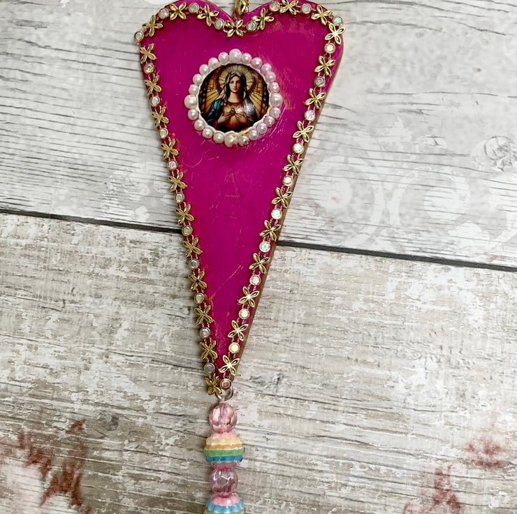 This Madonna hanging heart blends traditional sacred art with a contemporary handmade touch — perfect for anyone who loves faith-inspired art, Catholic icons, or unique handcrafted home décor.