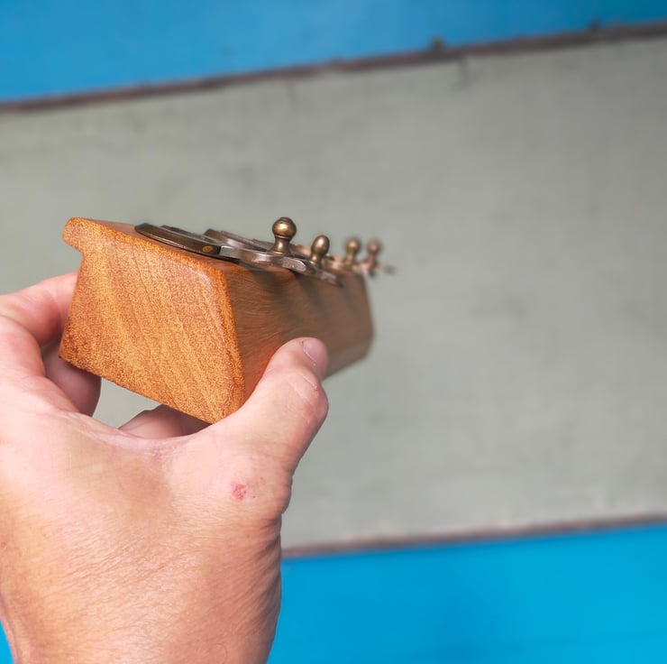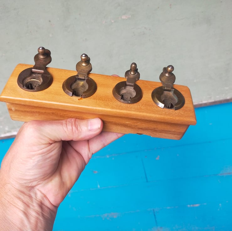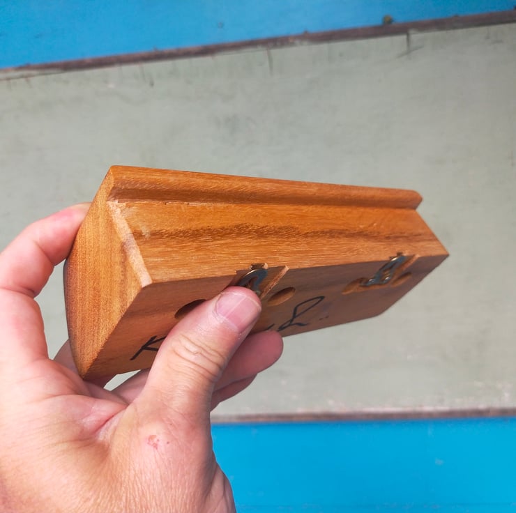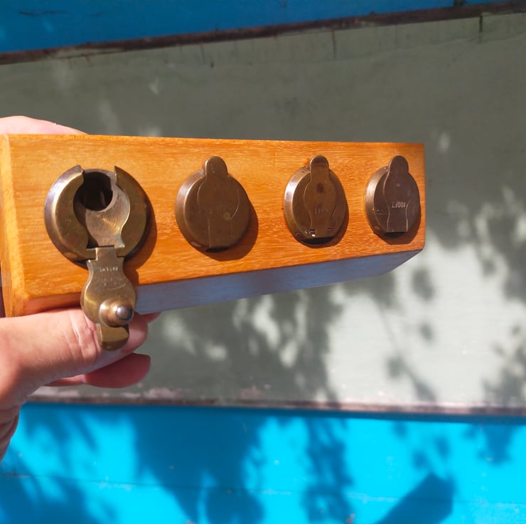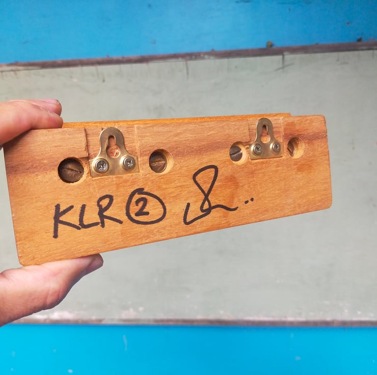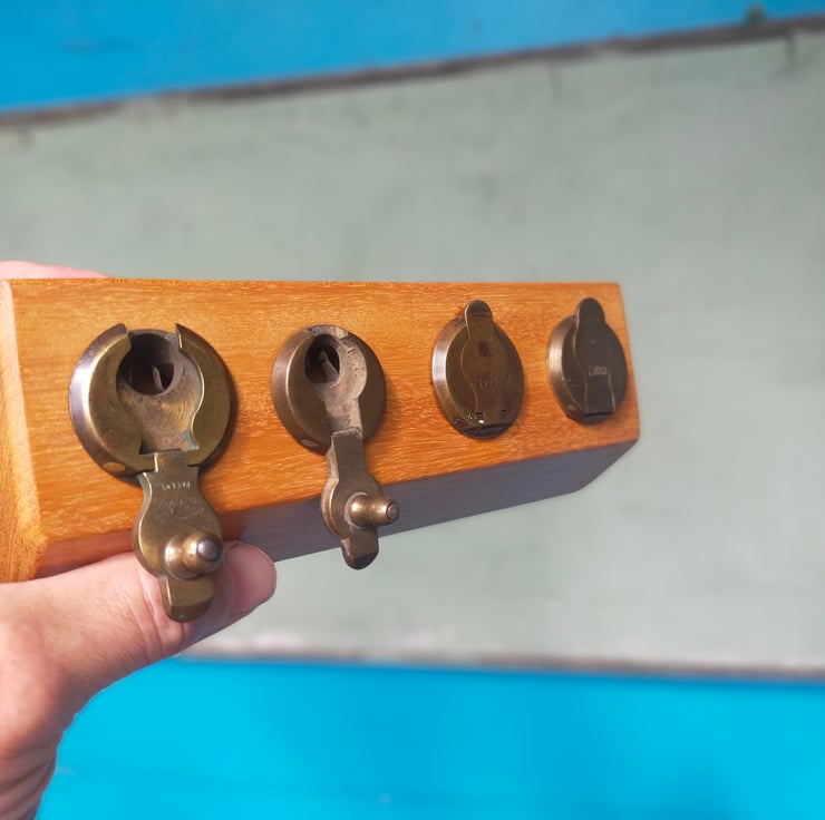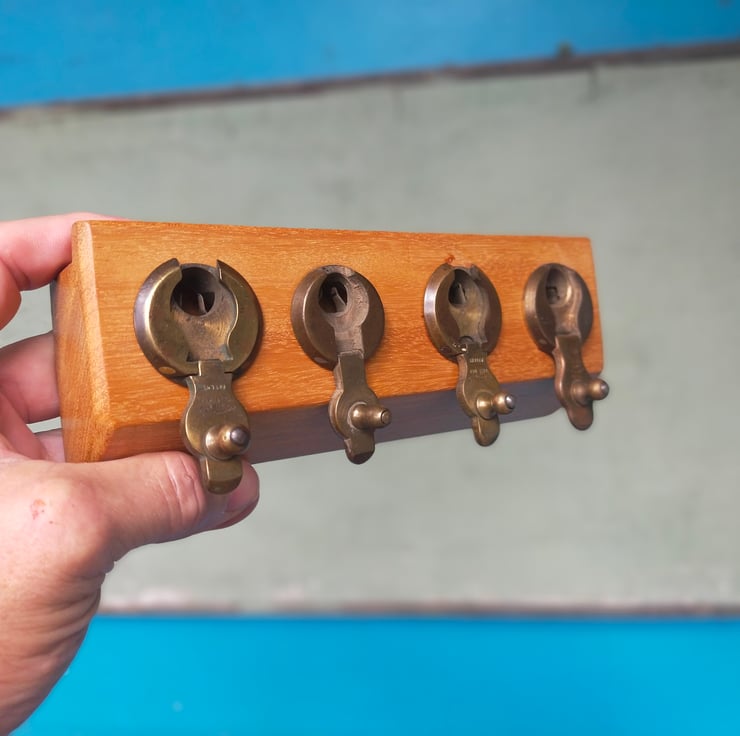 If you are of a certain age, you will remember the big leather tape measures brought out on sports days, with their elaborate brass mechanisms for winding the tape back in. These racks are all crafted from a solid block of reclaimed Brazilian mahogany, into which the winding mechanisms have been embedded, many with their embossed leather surrounds, to create a characterful and distinctive piece of retro home furnishing that will be a talking point for all your guests. Brass on mahogany is a classic look, evocative of our seafaring history; throw in some well worn embossed leather and I think you have a beautiful combination. Add to that the knowledge that these tape measures have had a long life measuring out the long jumps and javelin throws of British youth, and you have a beautiful and evocative addition to your home. Of course the actual tapes themselves don't go to waste, as can be seen from my door screens. I have used mirror slots as a hidden fixing and given them a clear wax finish.